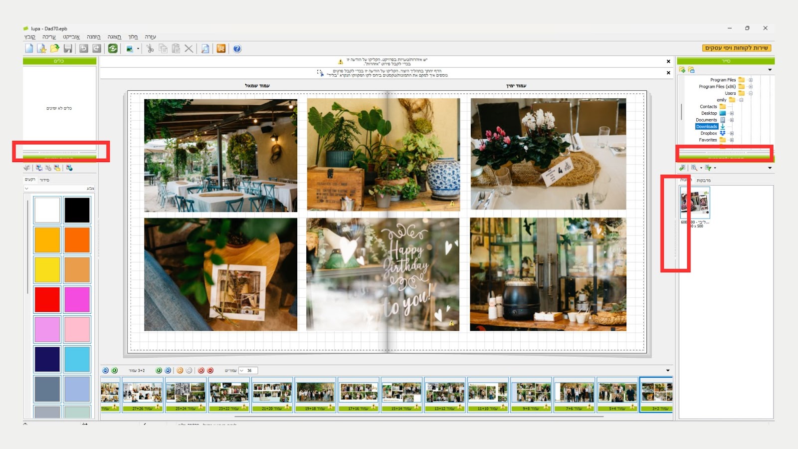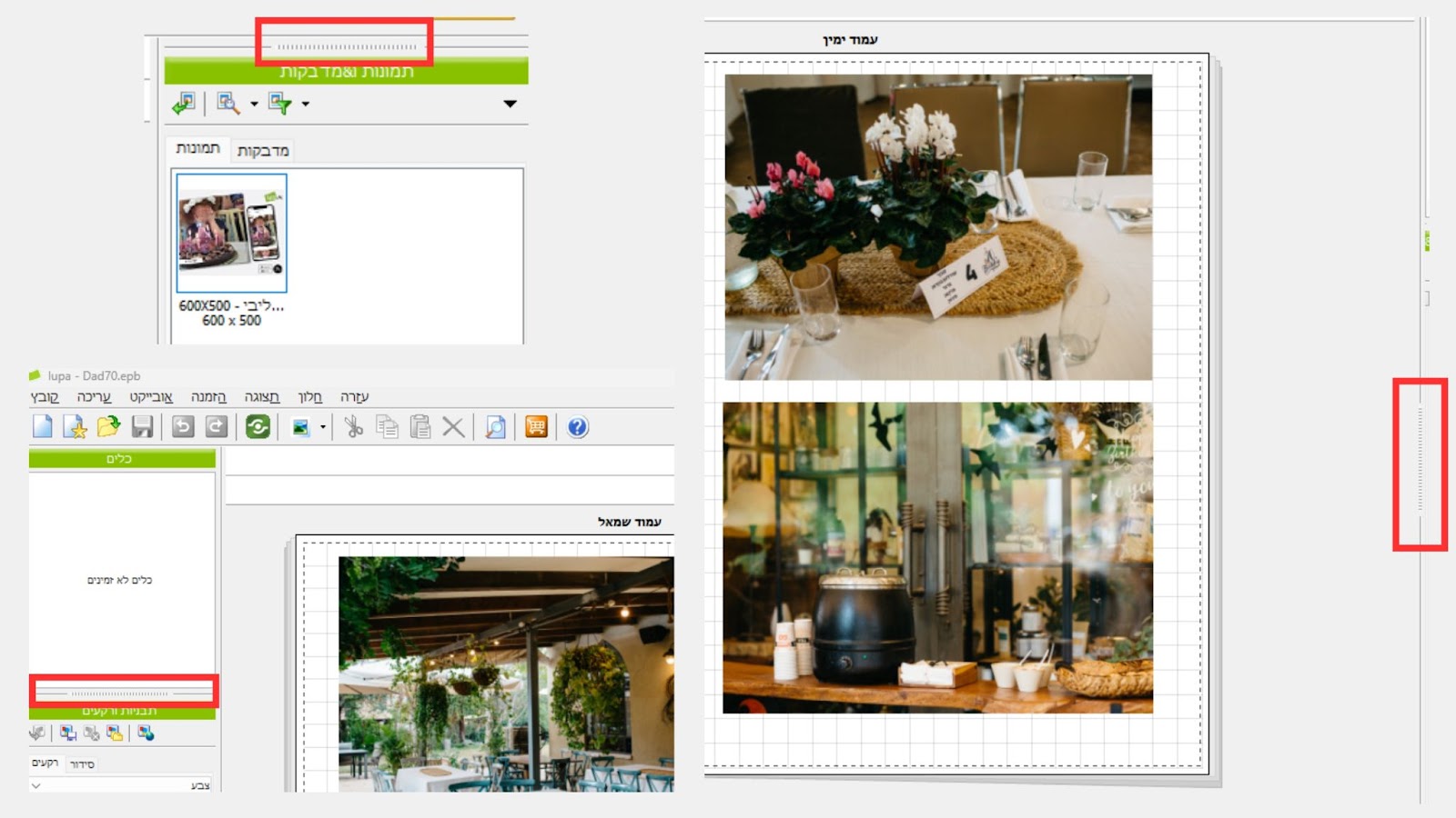הסתרה וגילוי מחדש של חלונות תפריטים אפשרית במהלך העבודה על עיצוב ספר בתוכנת לופה.